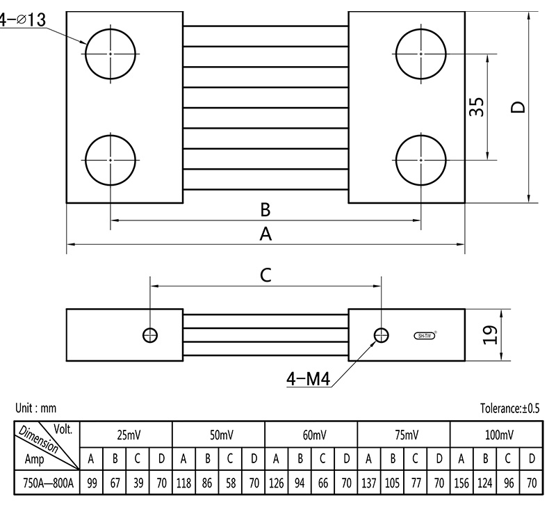 3)Temperature rise: Electrify the shunt with rated current for 2hr, test it after temperature rising stable, the temperature rise should be≤80K when the rated current under 100A; and should be ≤120K when the rated current higher than 100A.