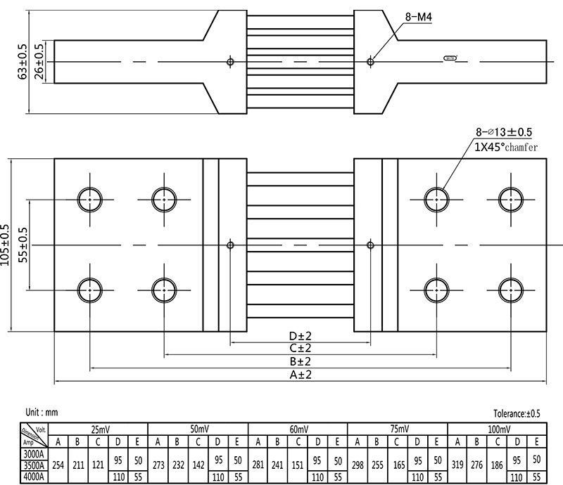 3)Temperature rise: Electrify the shunt with rated current for 2hr, test it after temperature rising stable, the temperature rise should be≤80K when the rated current under 100A; and should be ≤120K when the rated current higher than 100A.