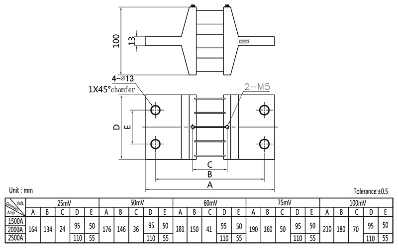 3)Temperature rise: Electrify the shunt with rated current for 2hr, test it after temperature rising stable, the temperature rise should be≤80K when the rated current under 100A; and should be ≤120K when the rated current higher than 100A.